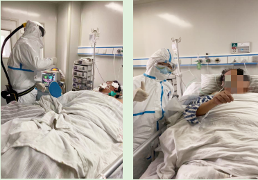 由于任老伯年齡比較大,又有多種基礎(chǔ)疾病,他的護(hù)理工作量大又費(fèi)時(shí)費(fèi)力。護(hù)士們必須長(zhǎng)時(shí)間對(duì)患者進(jìn)行持續(xù)的觀察和護(hù)理,每天都有五六名護(hù)士24 小時(shí)值守在任老伯身邊,每天不斷的重復(fù)給他吸痰、俯臥位通氣、口腔護(hù)理、鼻飼翻身、上呼吸機(jī)……這些平常在重癥醫(yī)學(xué)科病房干的活兒,在此種具有人傳人特征的病毒面前卻變得復(fù)雜起來(lái)。同時(shí),他們還要及時(shí)處理隨時(shí)發(fā)生各種突發(fā)狀況。有時(shí)任老伯血流動(dòng)力學(xué)出現(xiàn)波動(dòng),我們就為他建立升壓的單獨(dú)通路;有時(shí)候是氧合下降,我們就一起幫助任老伯翻身,行俯臥位通氣操作……