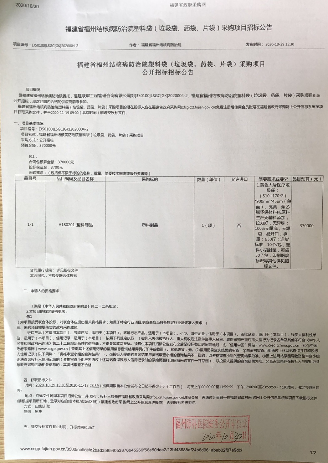 福建省福州結(jié)核病防治院塑料袋(垃圾袋、藥袋、片袋)采購項(xiàng)目招標(biāo)公告