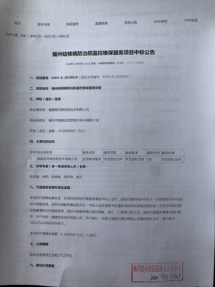 福州結(jié)核病防治院監(jiān)控維保服務(wù)項(xiàng)目中標(biāo)公告