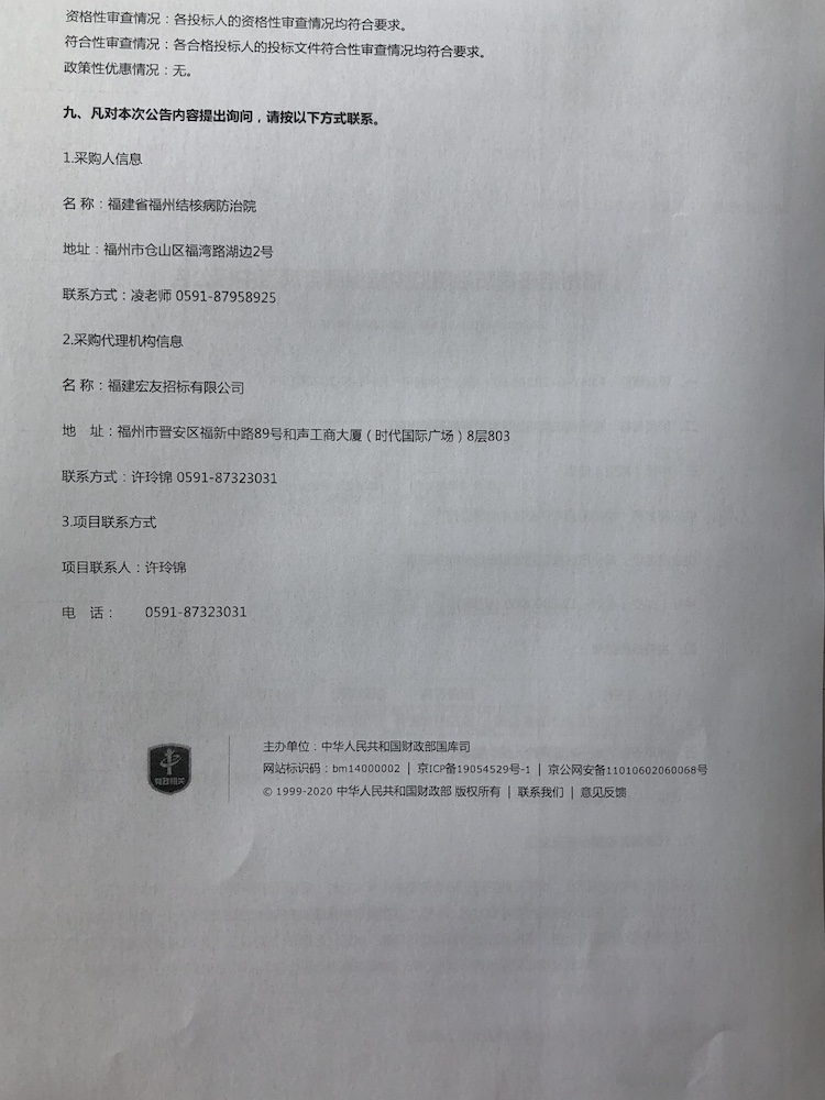 福建省福州結(jié)核病防治院醫(yī)療設(shè)備采購項(xiàng)目中標(biāo)公告