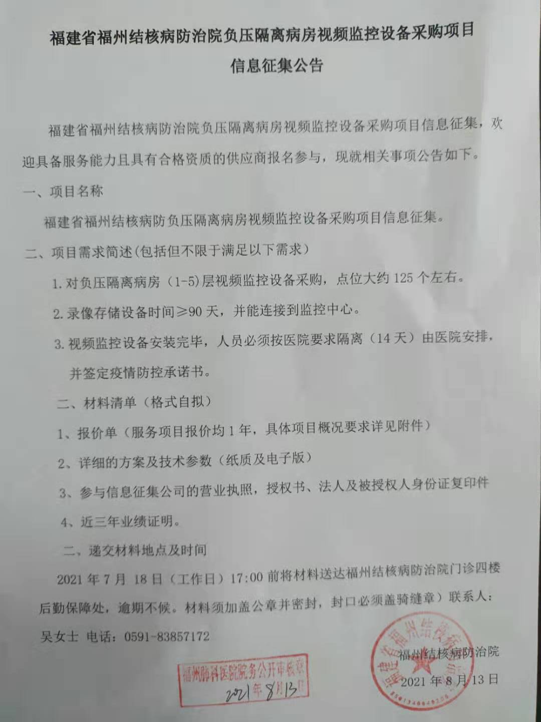 福建省福州結(jié)核病防治院負壓隔離病房視頻監(jiān)控設備采購項目信息征集公告