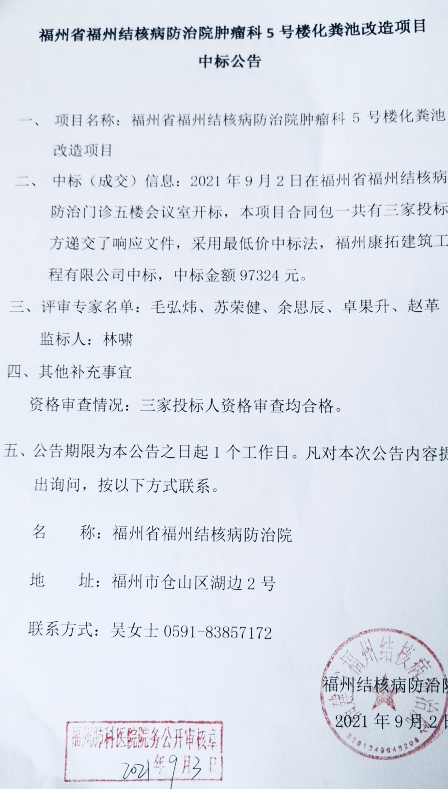 福州省福州結(jié)核病防治院腫瘤科5號(hào)樓化糞池改造項(xiàng)目中標(biāo)公告