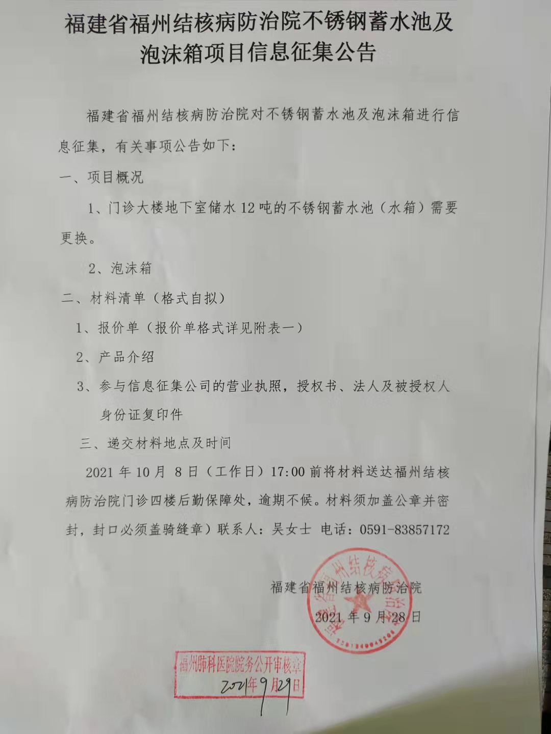 福建省福州結(jié)核病防治院不銹鋼蓄水池及泡沫箱項(xiàng)目信息征集公告