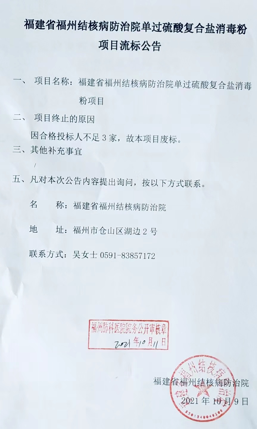 福建省福州結(jié)核病防治院單過硫酸復(fù)合鹽消毒粉項目流標(biāo)公告
