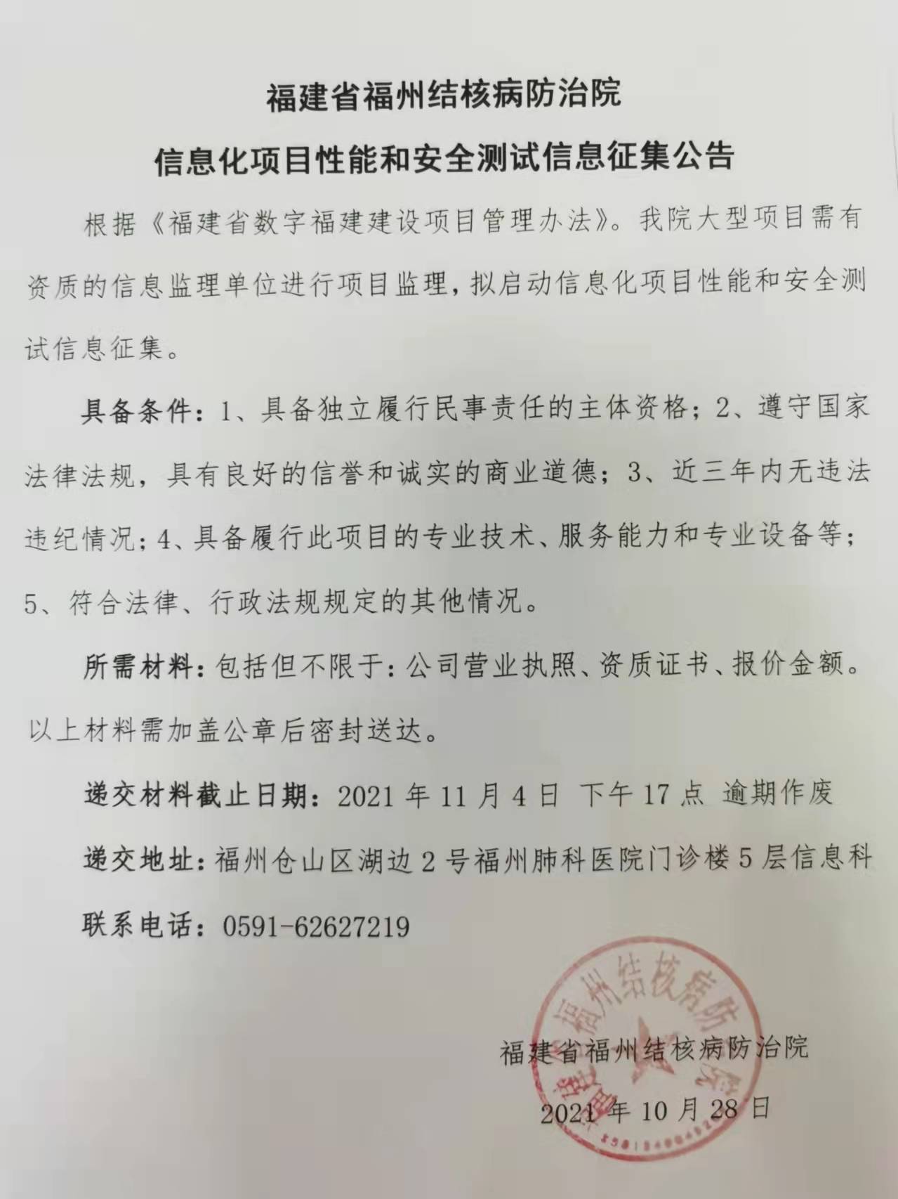 福建省福州結(jié)核病防治院信息化項(xiàng)目性能和安全測(cè)試信息征集公告