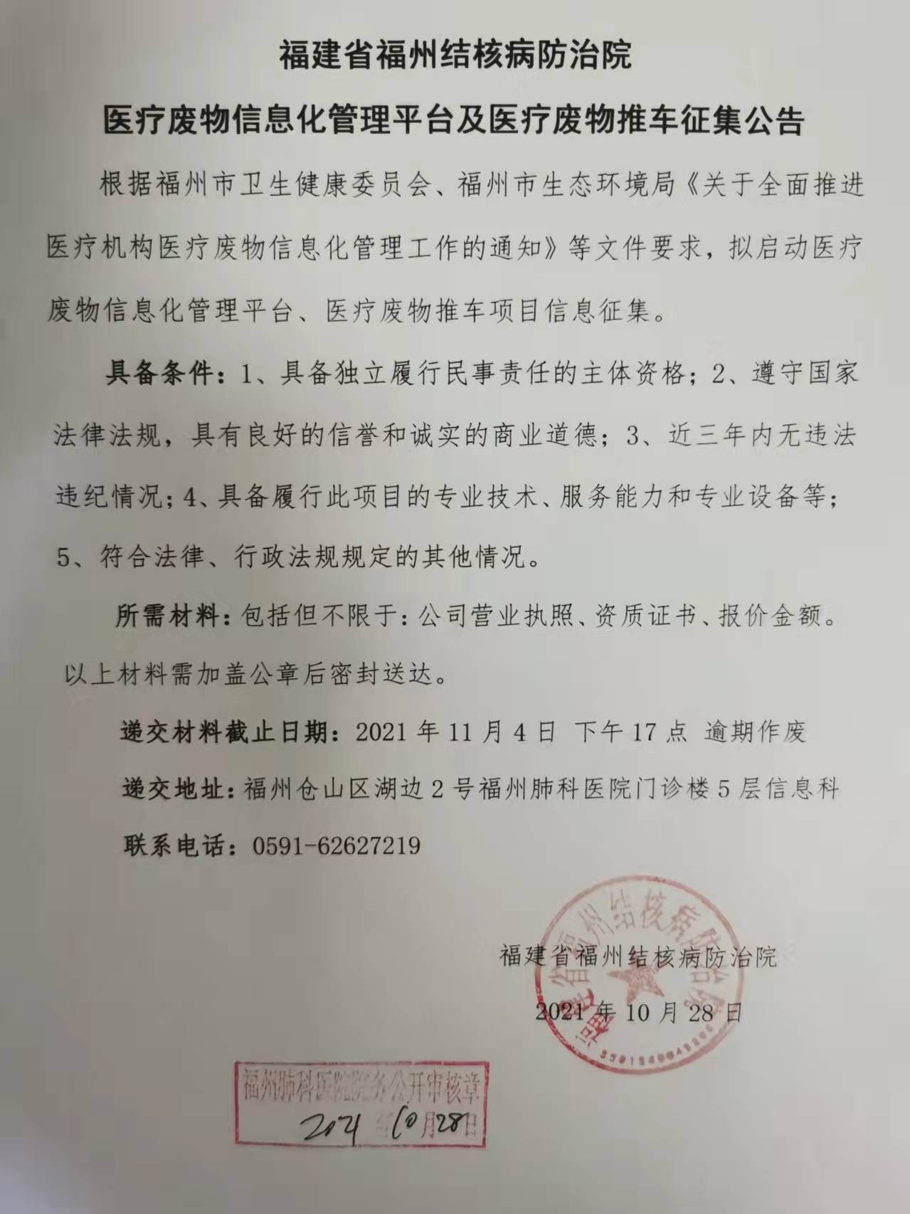 福建省福州結(jié)核病防治院醫(yī)療廢物信息化管理平臺(tái)及醫(yī)療廢物推車征集公告