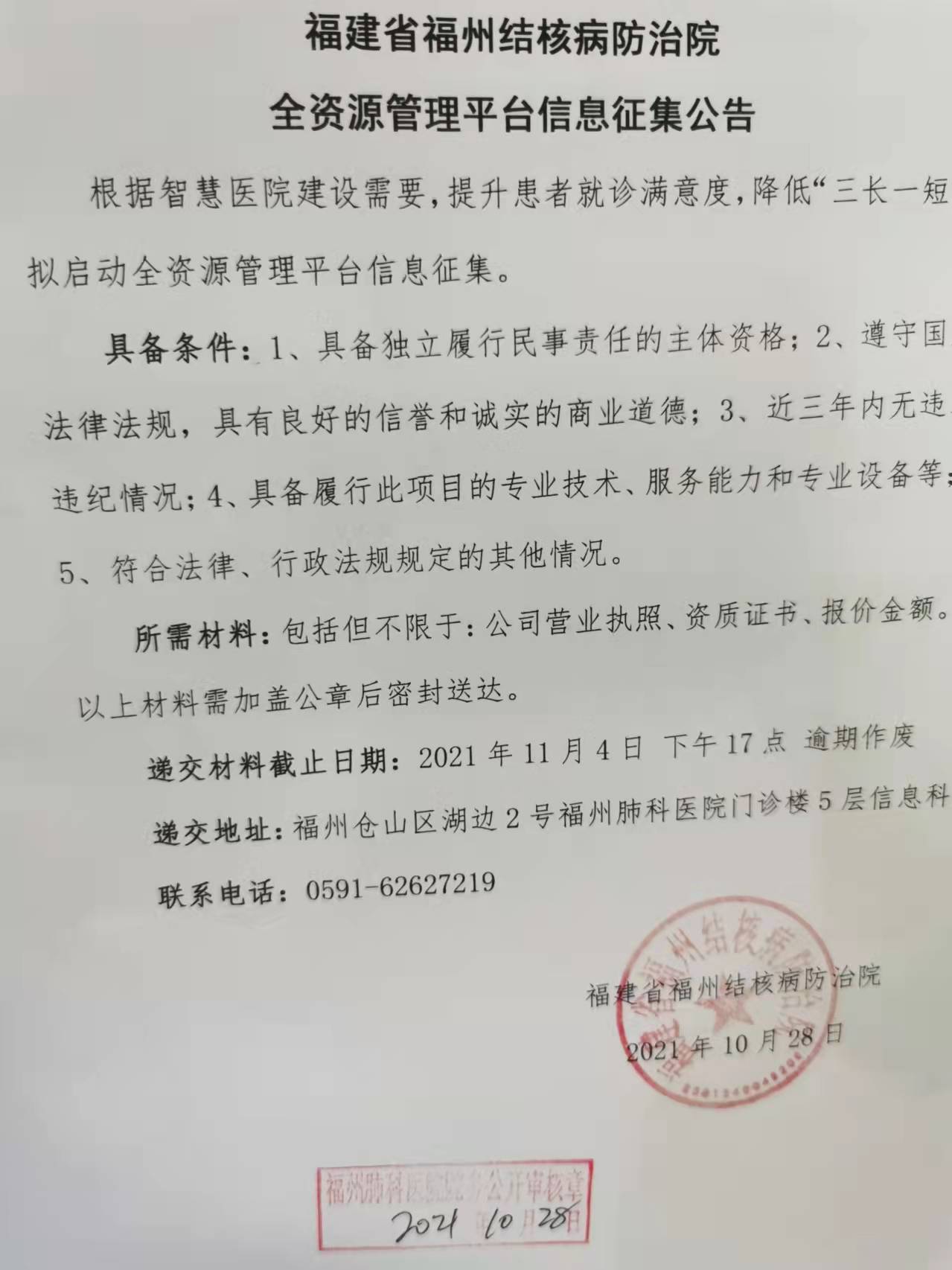 福建省福州結(jié)核病防治院 全資源管理平臺(tái)信息征集公告