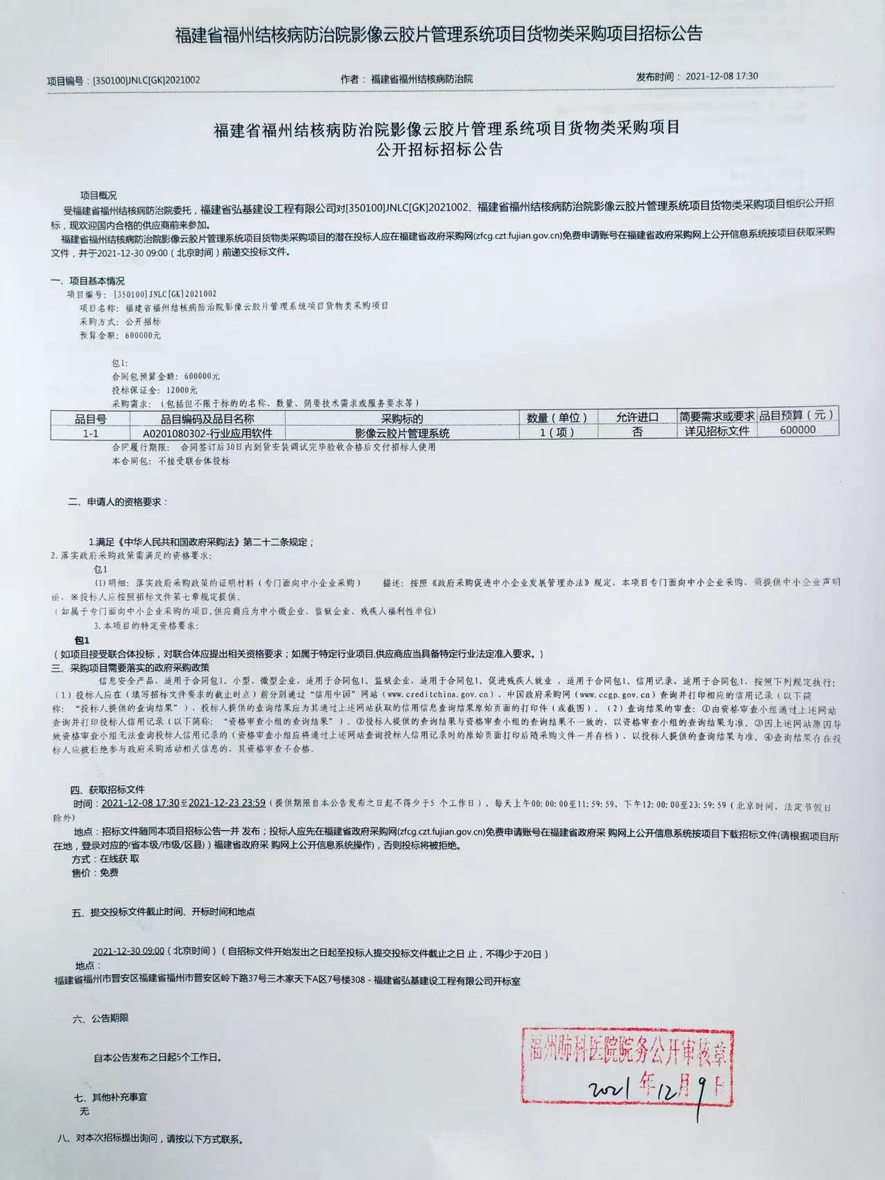 福建省福州結(jié)核病防治院影像云膠片管理系統(tǒng)項目貨物類采購項目招標公告