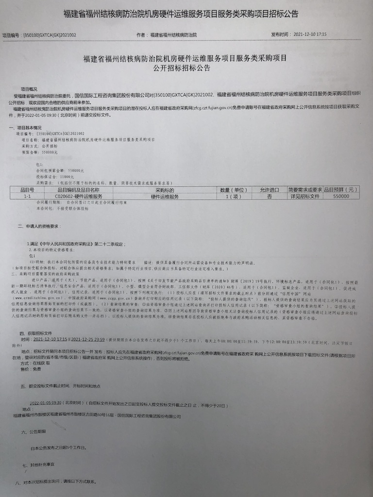 福建省福州結(jié)核病防治院機(jī)房硬件運(yùn)維服務(wù)項(xiàng)目服務(wù)類采購(gòu)項(xiàng)目招標(biāo)公告
