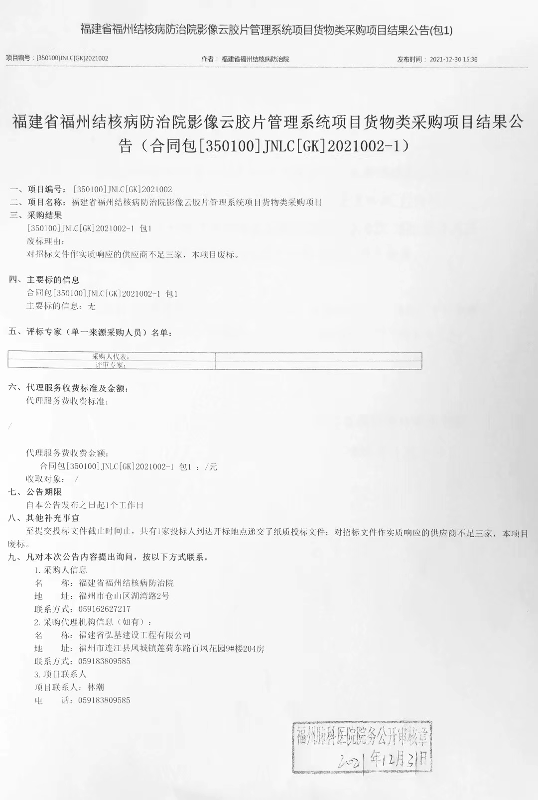 福建省福州結(jié)核病防治院影像云膠片管理系統(tǒng)項目貨物類采購項目結(jié)果公告(包1)