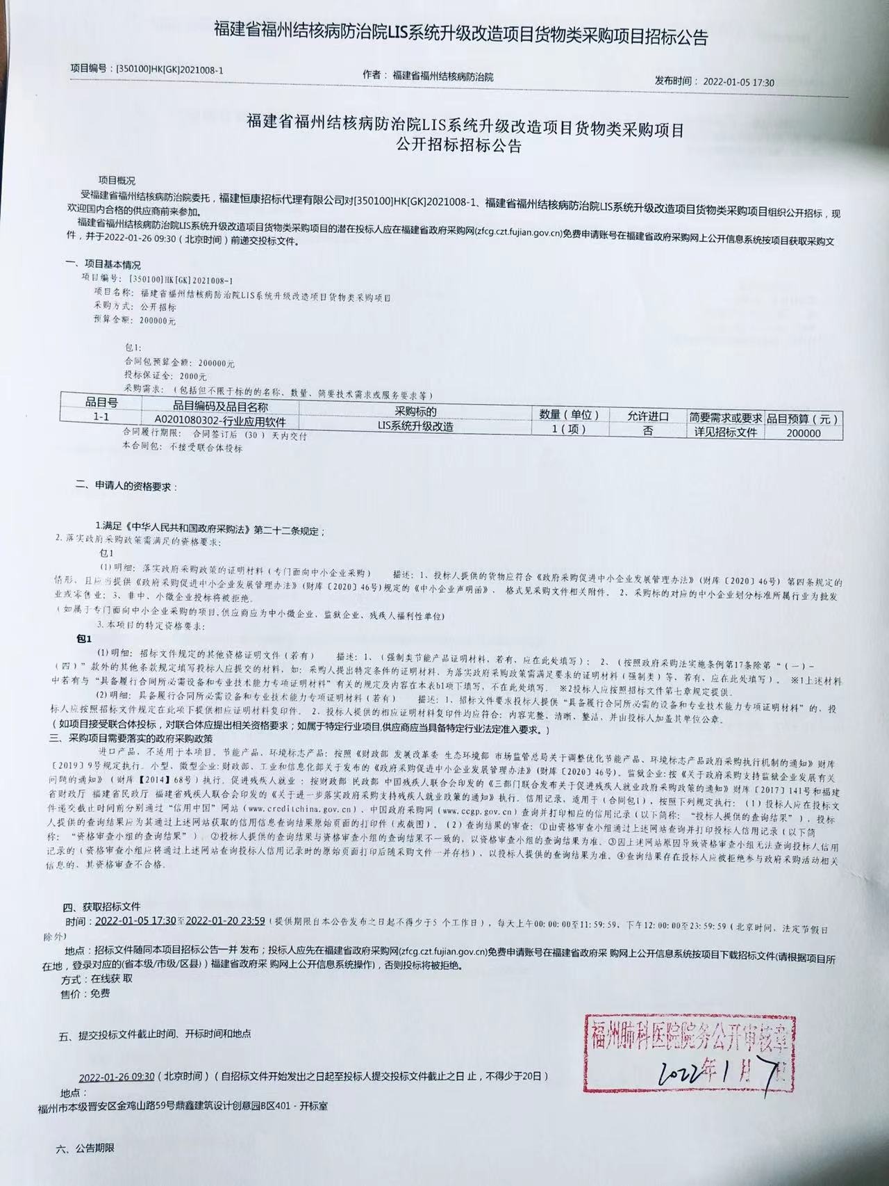 福建省福州結核病防治院LS系統(tǒng)升級改造項目貨物類采購項目招標公告