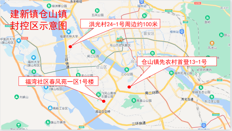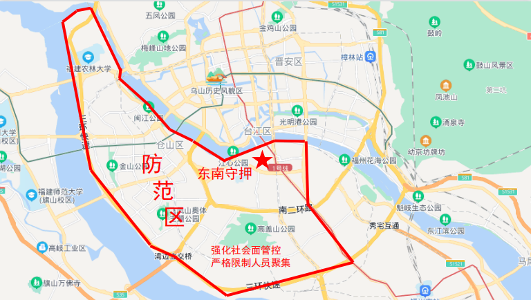 將倉(cāng)山區(qū)連江南路往南經(jīng)則徐大道與三環(huán)快速路交界,沿三環(huán)快速路以西、以北全域劃定為防范區(qū),實(shí)行“強(qiáng)化社會(huì)面管控,嚴(yán)格限制人員聚集”的管控措施。