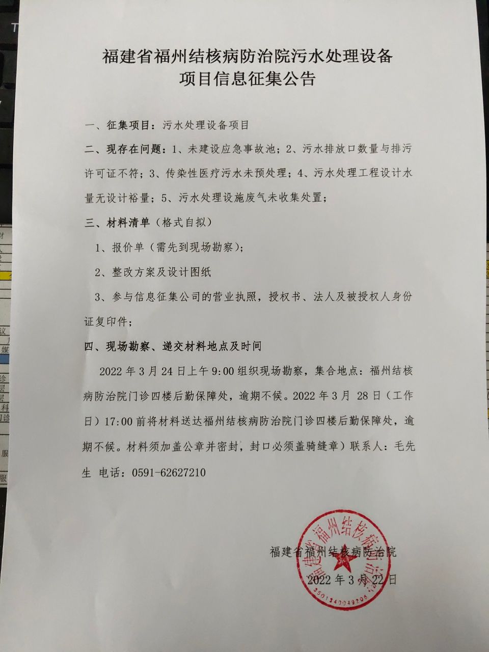 福建省福州結(jié)核病防治院污水處理設(shè)備項目信息征集公告