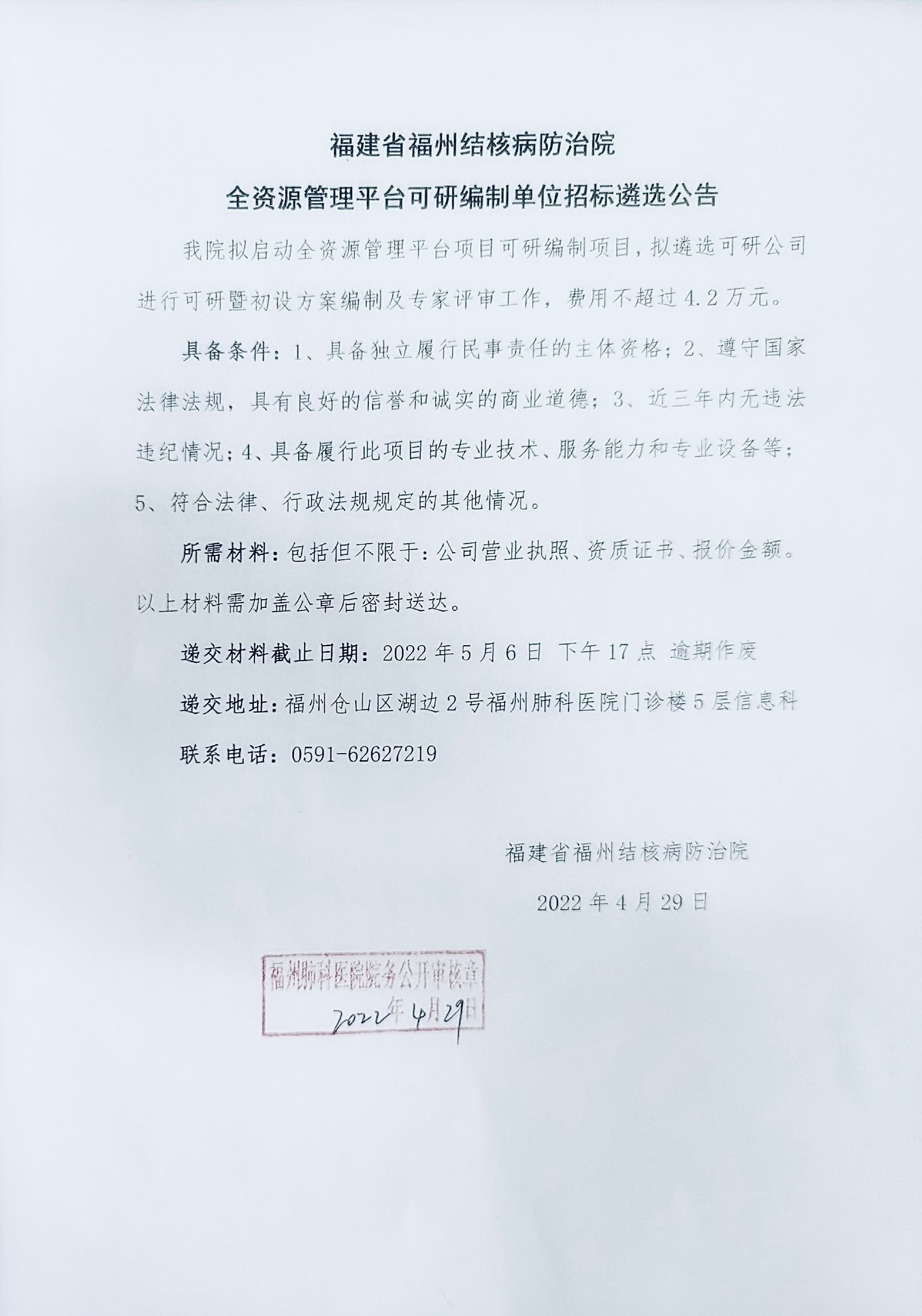福建省福州結(jié)核病防治院全資源管理平臺(tái)可研編制單位招標(biāo)遴選公告