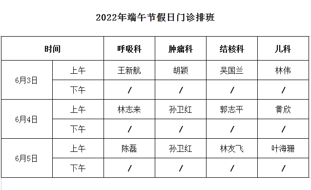 根據(jù)上級(jí)通知,2022年端午節(jié)定于6月3日(星期五)~5日(星期日)放假。放假期間,醫(yī)院安排節(jié)假日門診,現(xiàn)場(chǎng)取號(hào),具體排班如下: