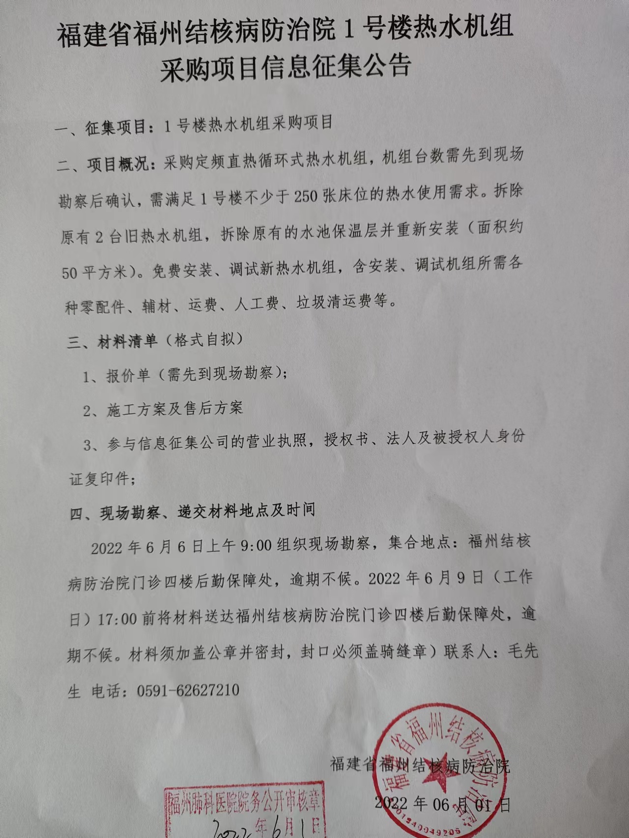 福建省福州結(jié)核病防治院1號樓熱水機(jī)組采購項(xiàng)目信息征集公告