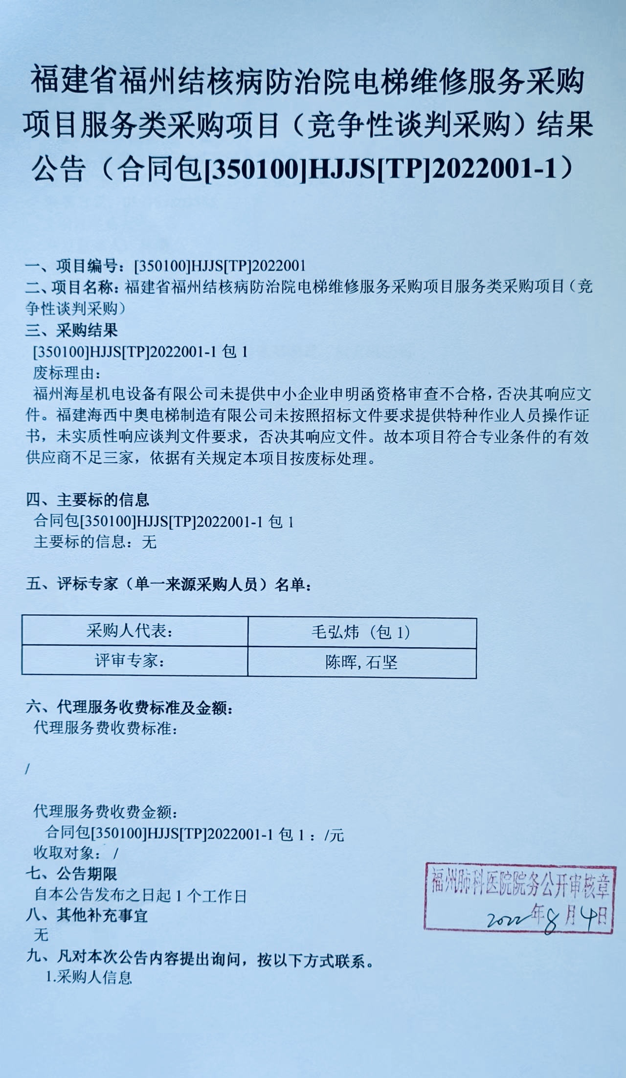 福建省福州結(jié)核病防治院電梯維修服務(wù)采購(gòu)項(xiàng)目服務(wù)類采購(gòu)項(xiàng)目(競(jìng)爭(zhēng)性談判采購(gòu))結(jié)果公告