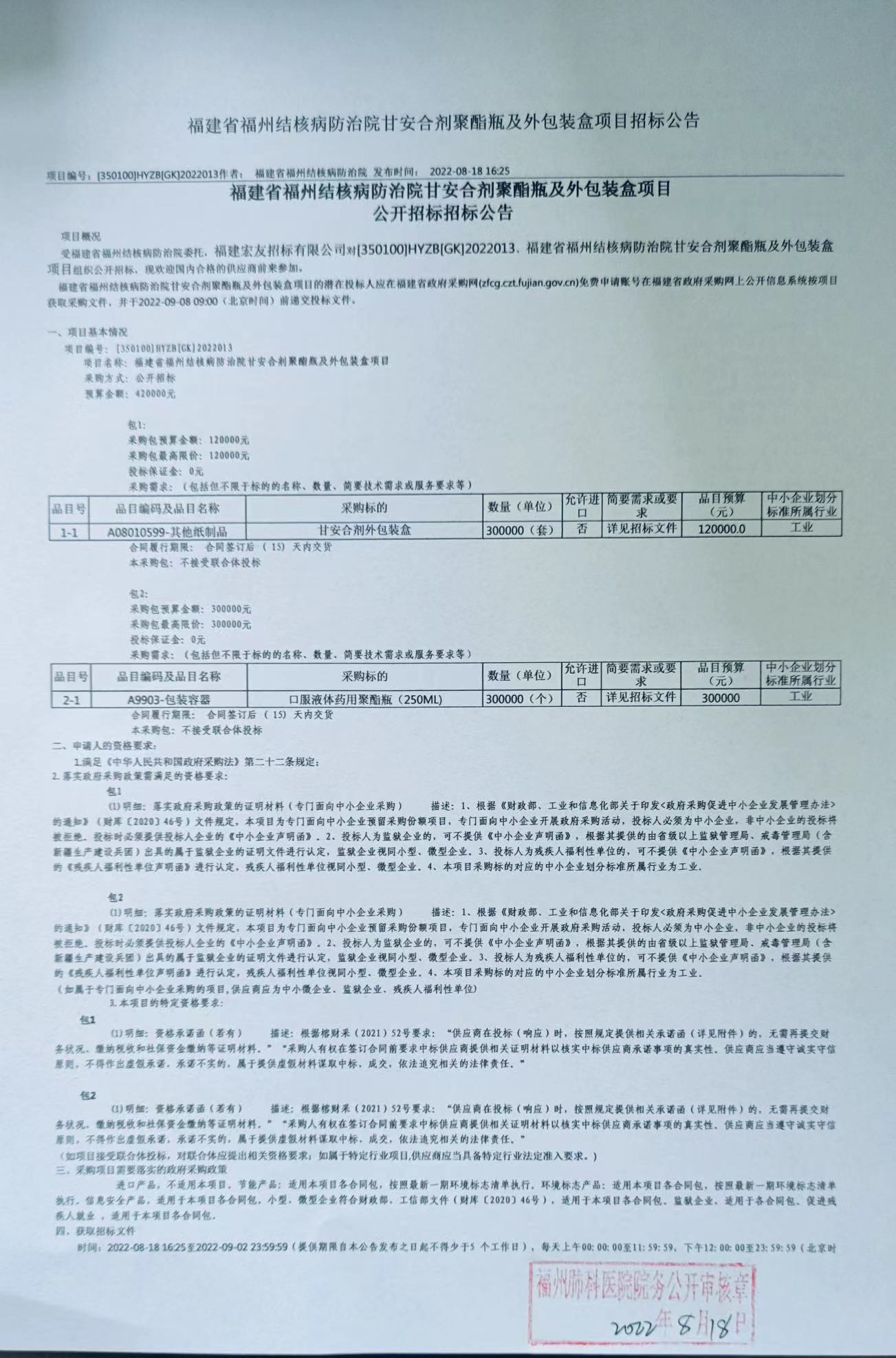 福建省福州結(jié)核病防治院甘安合劑聚酯瓶及外包裝盒項(xiàng)目招標(biāo)公告