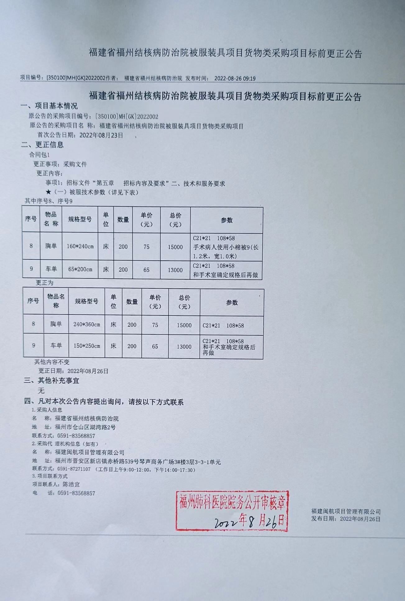福建省福州結(jié)核病防治院被服裝具項目貨物類采購項目標前更正公告