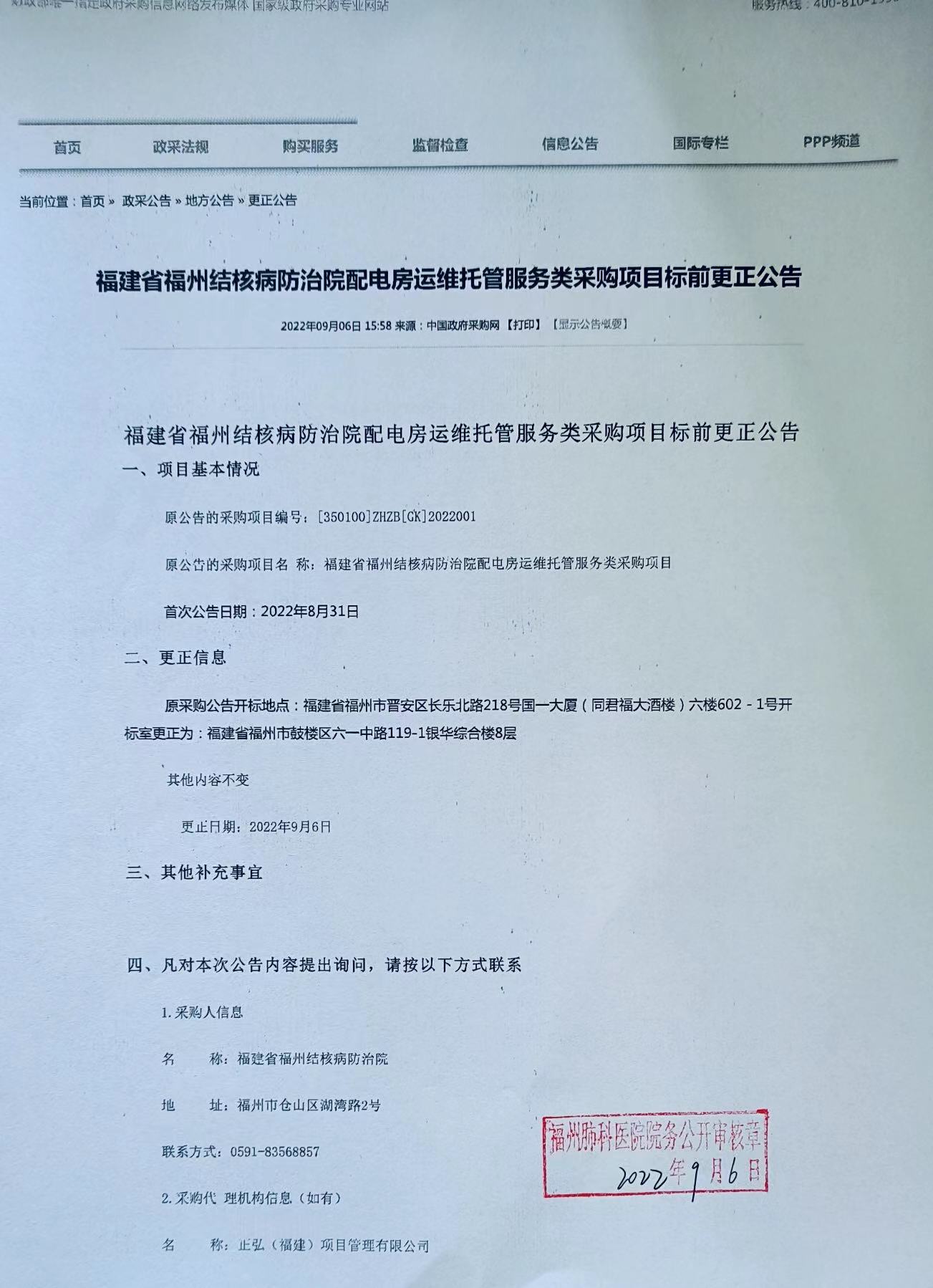 福建省福州結(jié)核病防治院配電房運(yùn)維托管服務(wù)類采購(gòu)項(xiàng)目標(biāo)前更正公告