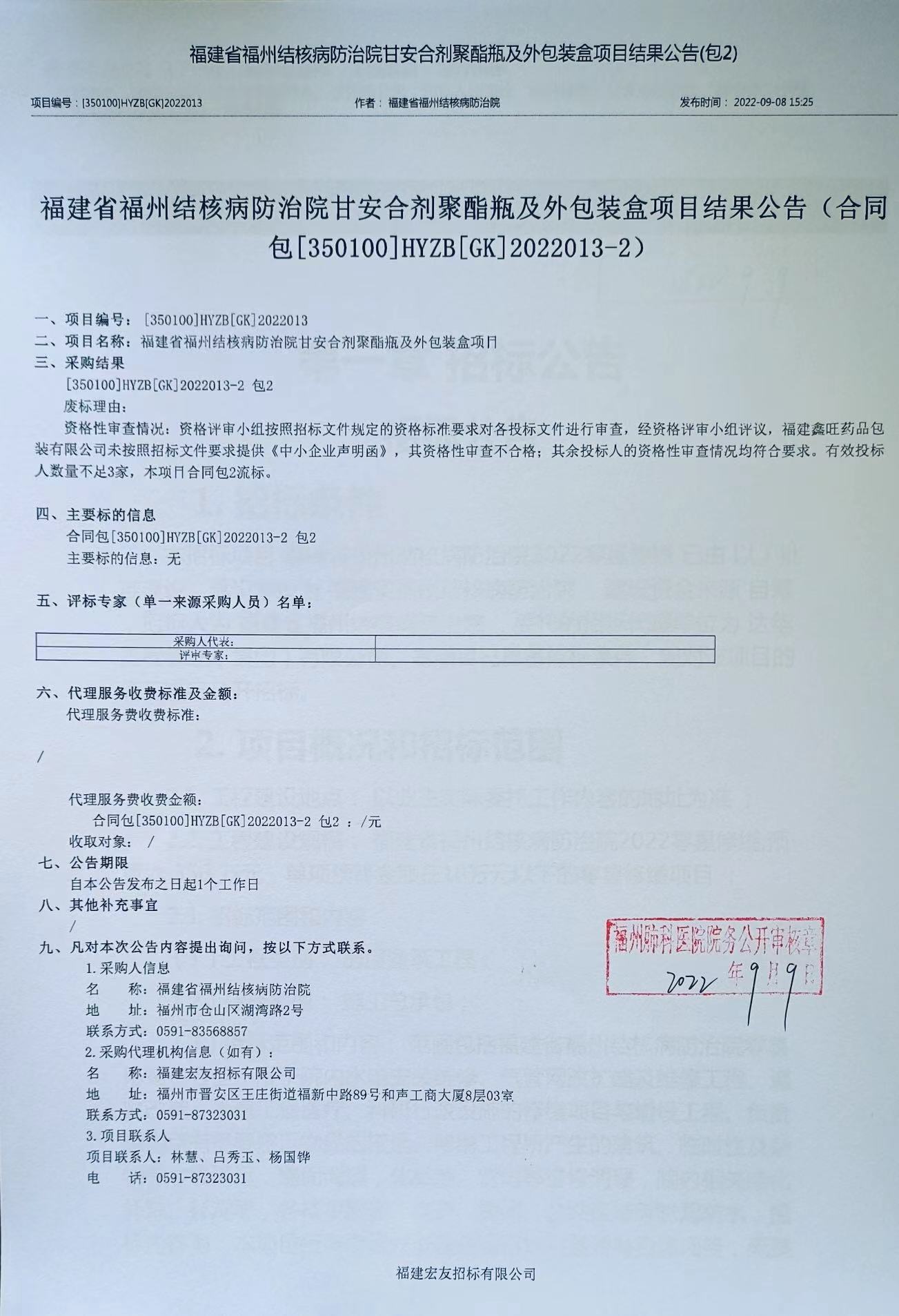 福建省福州結(jié)核病防治院甘安合劑聚酷瓶及外包裝項(xiàng)目結(jié)果公告(包2)