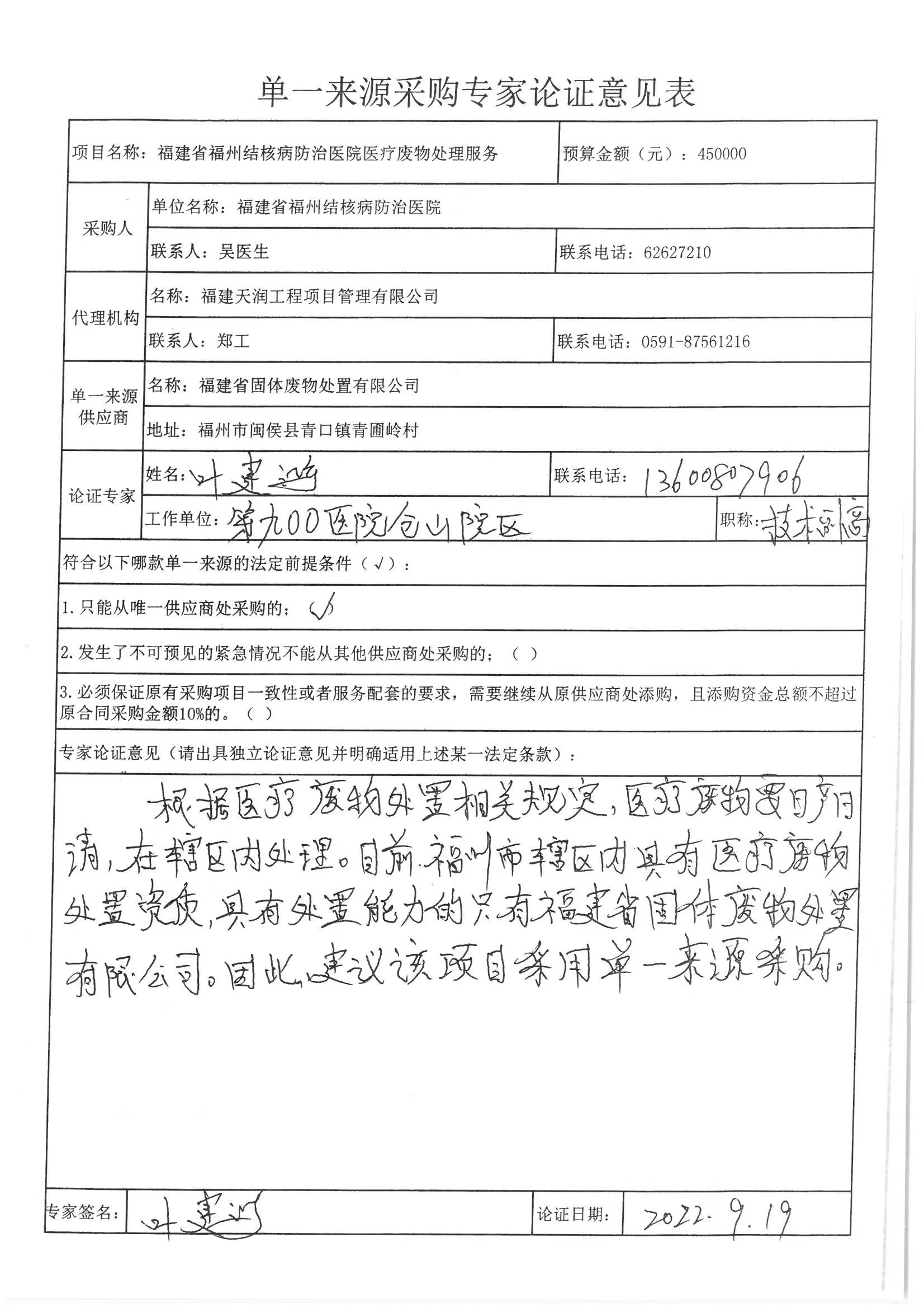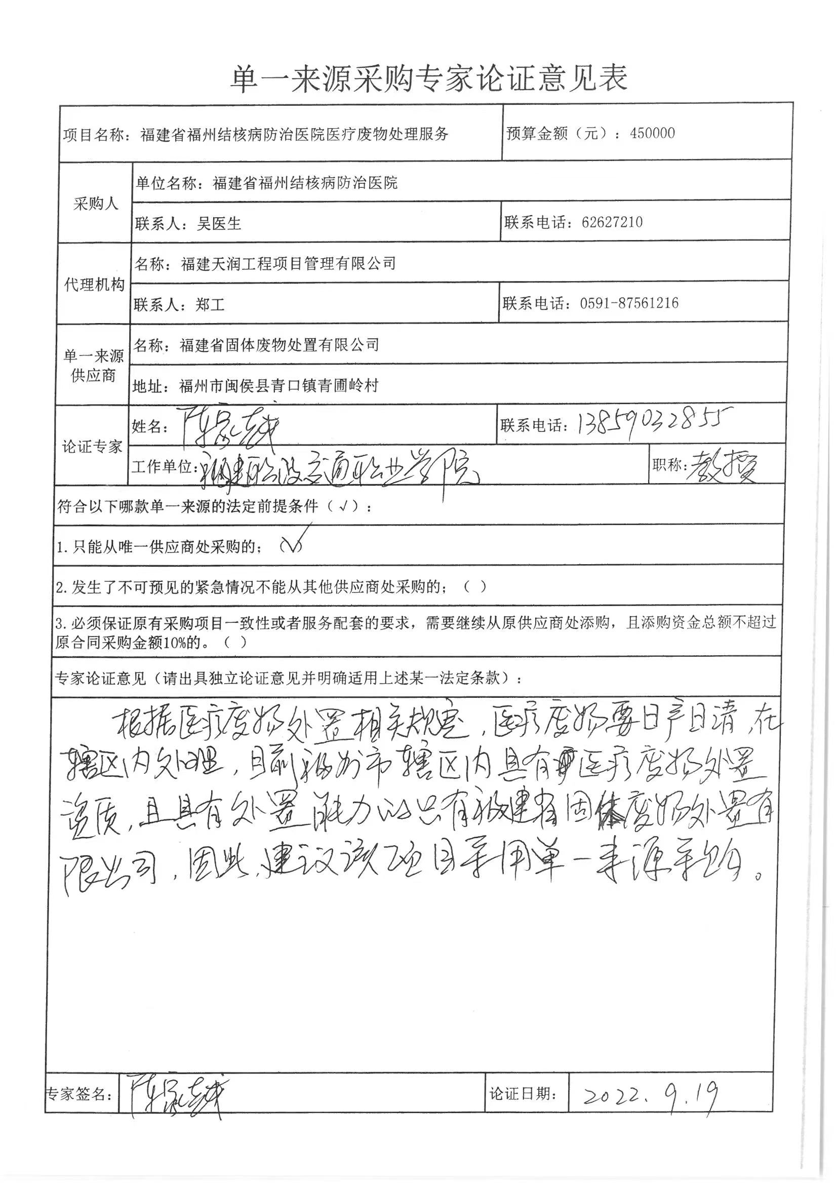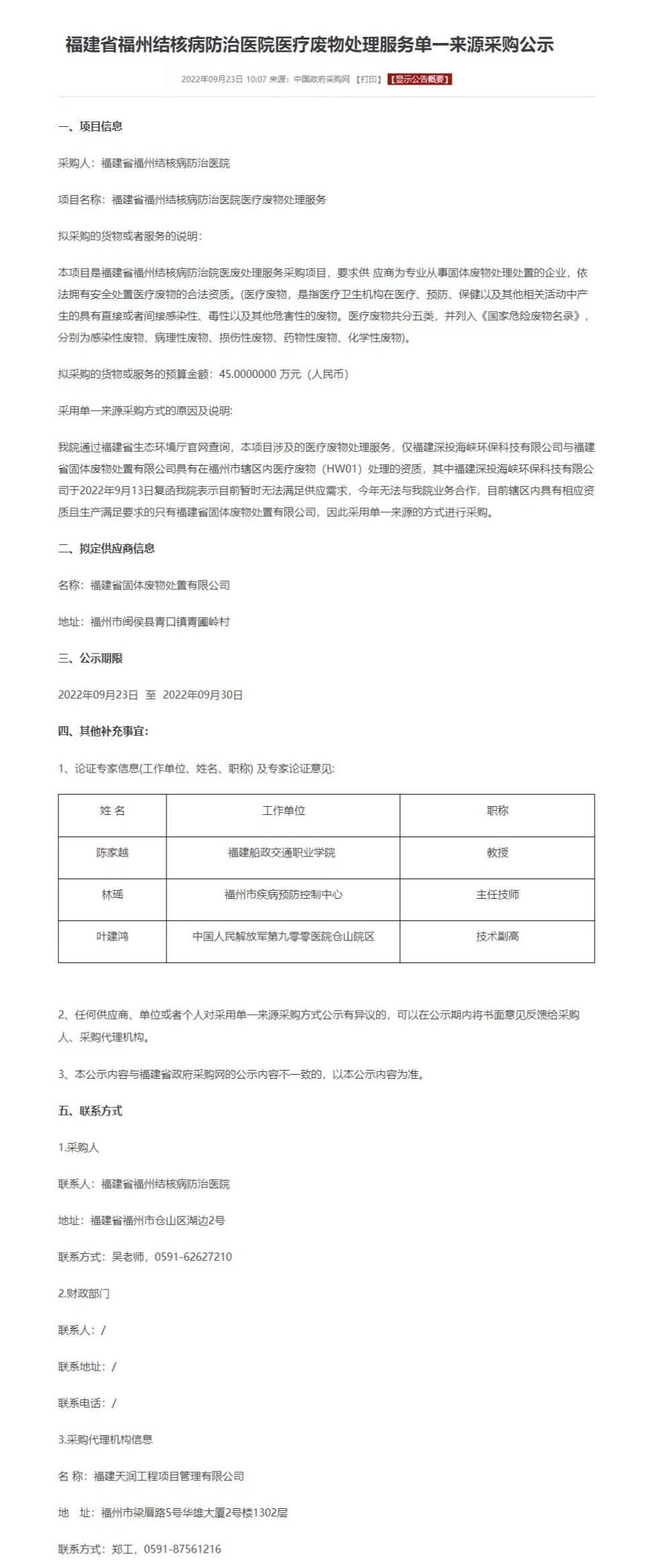 福建省福州結(jié)核病防治醫(yī)院醫(yī)療廢物處理服務(wù)單一來源采購公示