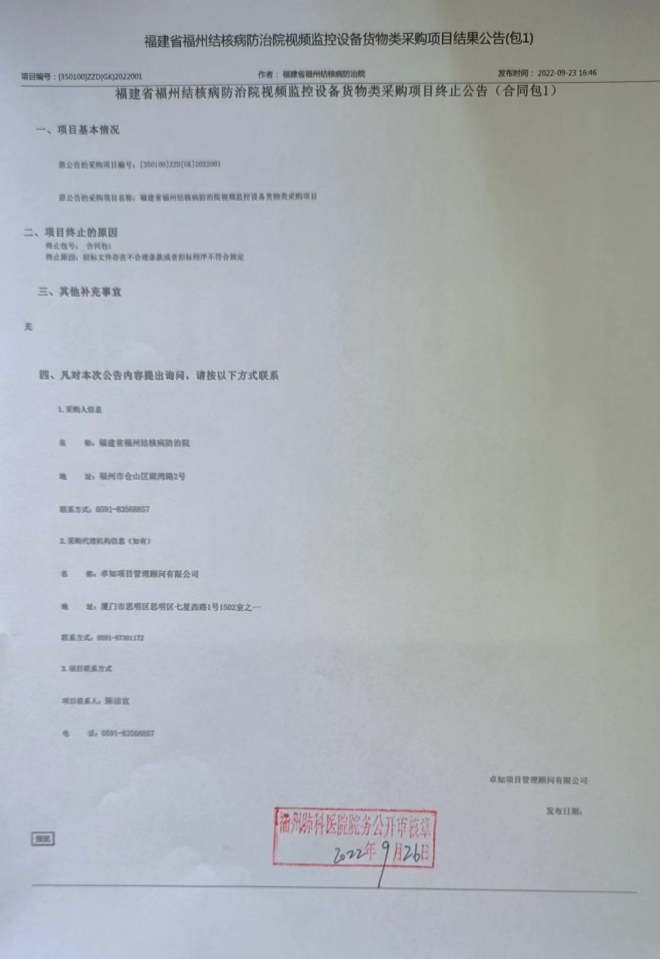 福建省福州結(jié)核病防治院視頻監(jiān)控設(shè)備貨物類采購項(xiàng)目結(jié)果公告(包1)