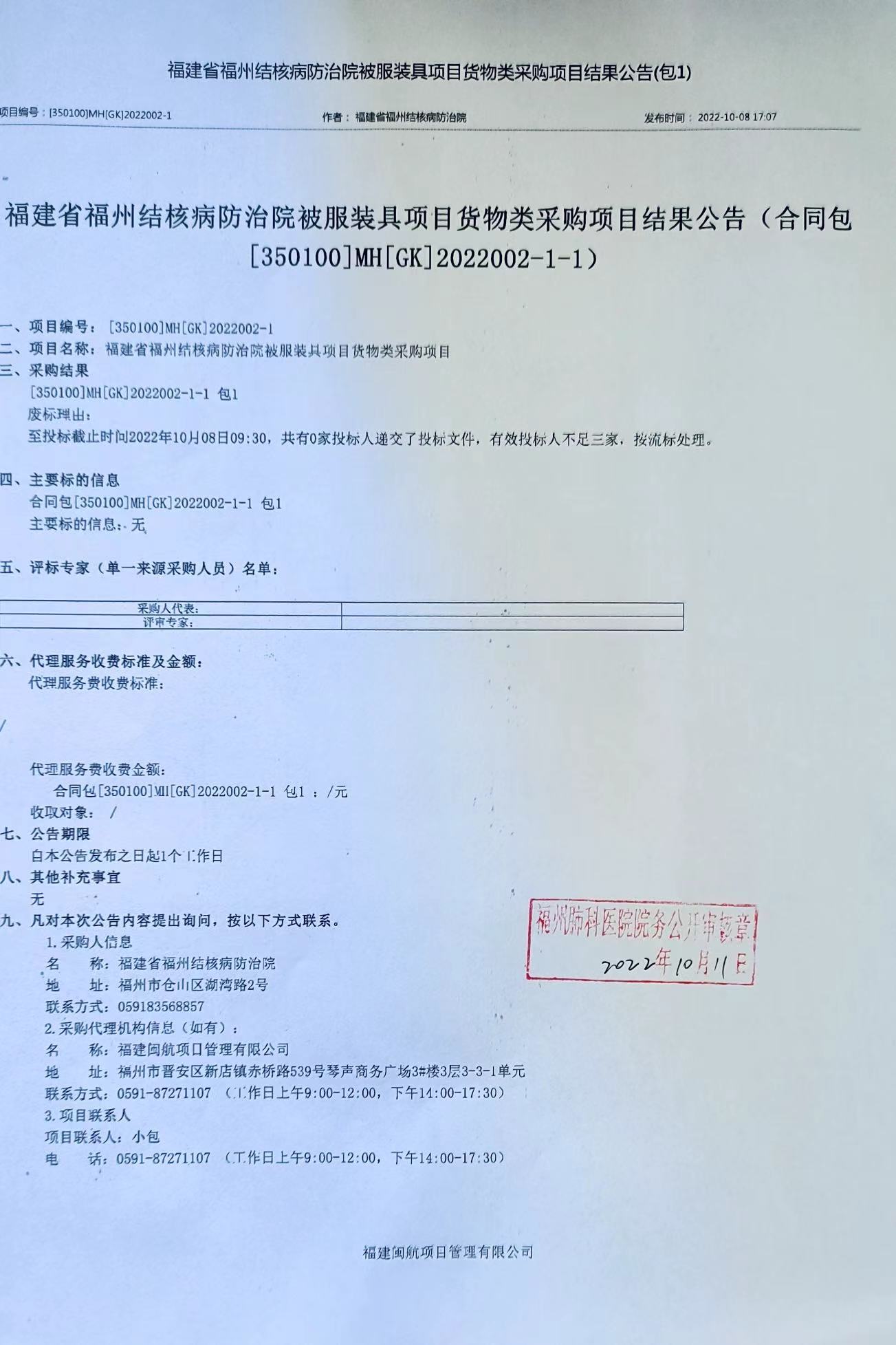 福建省福州結(jié)核病防治院被服裝具項(xiàng)目貨物類采購項(xiàng)目結(jié)果公告(包1)