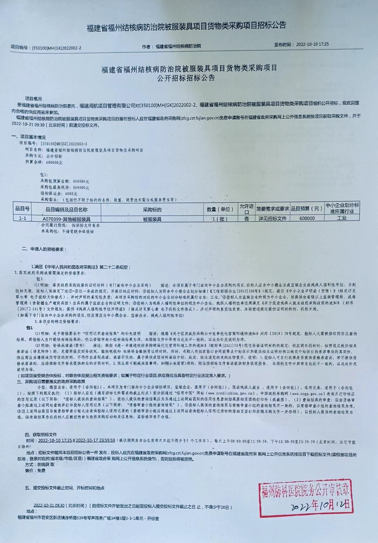 福建省福州結(jié)核病防治院被服裝具項(xiàng)目貨物類采購項(xiàng)目招標(biāo)公告