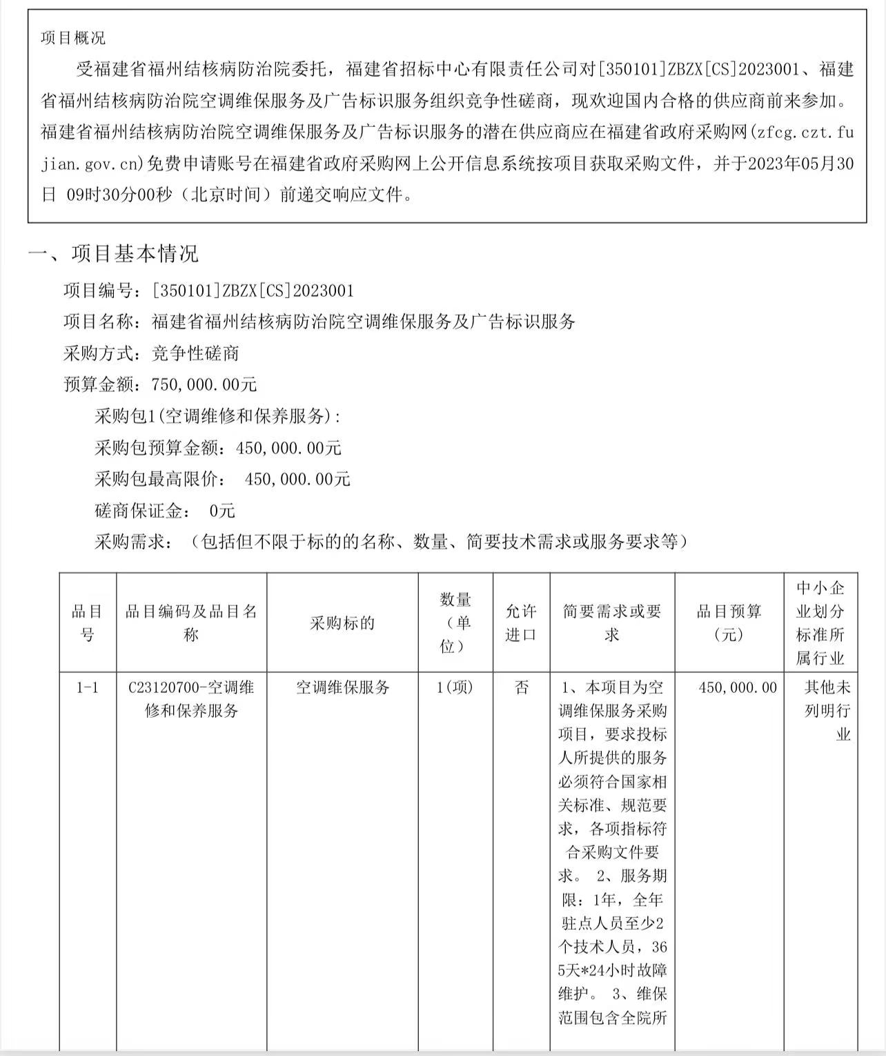 福建省福州結(jié)核病防治院空調(diào)維保服務(wù)及廣告標識服務(wù)競爭性磋商公告