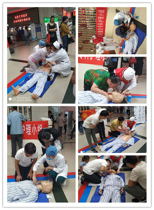 活動(dòng)現(xiàn)場,黨員志愿者分工協(xié)作演示心肺復(fù)蘇:一名黨員志愿者利用宣傳展板圖文并茂的內(nèi)容按順序?yàn)榇蠹疫M(jìn)行心肺復(fù)蘇通俗易懂的理論講解;另一名黨員志愿者配合理論講解現(xiàn)場演示每個(gè)步驟操作示范。