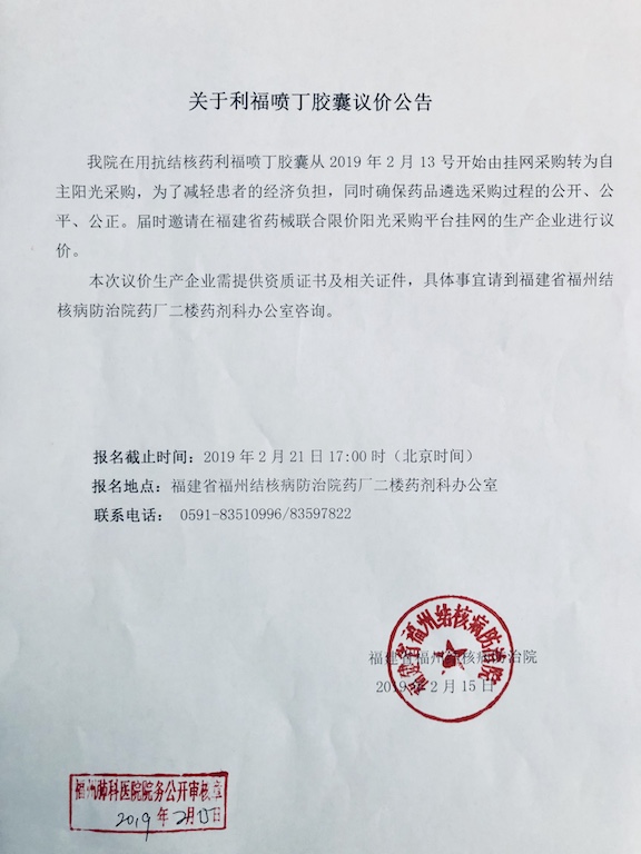 關(guān)于利福噴丁膠囊議價(jià)公告