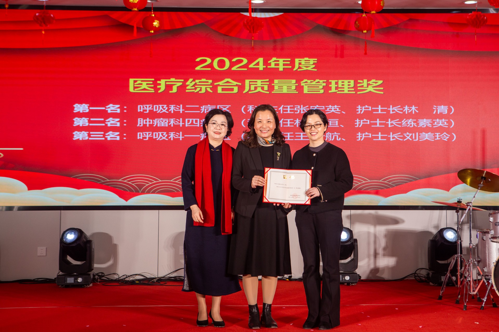 院黨委副書記、院長張郁瀾向大會作《福建省福州肺科醫(yī)院2024年工作總結(jié)》,全面回顧了2024年醫(yī)院在黨建引領(lǐng)、學科發(fā)展、人才培養(yǎng)、改善服務、行政管理、文明建設等方面取得的顯著成績,激勵全院干部職工砥礪前行,共創(chuàng)醫(yī)院發(fā)展嶄新篇章。會上,張院長宣讀表彰“2024年度醫(yī)療綜合質(zhì)量管理獎”名單:第一名呼吸與危重癥醫(yī)學科二病區(qū)、第二名腫瘤科四病區(qū)、第三名呼吸與危重癥醫(yī)學科一病區(qū);高書記宣讀表彰“援非特別貢獻獎”,高度肯定謝德辰同志作為第16批援博茨瓦納醫(yī)療隊隊員期間,4次主動提出延長援外時間,舍小家顧大家,以精湛醫(yī)術(shù)和赤誠大愛圓滿完成任務。希望全體職工以他們為榜樣,挺膺擔當,奉獻新時代,再創(chuàng)新輝煌!表彰結(jié)束后,全體院領(lǐng)導班子與獲獎人員合影留念。
